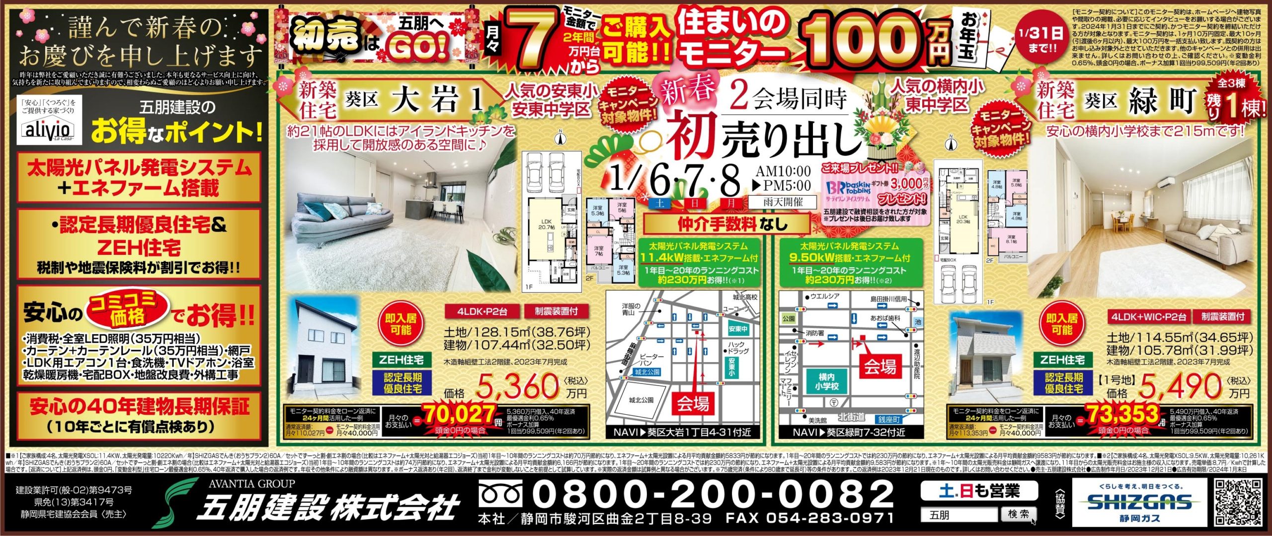 ☆初売りは 葵区緑町・大岩1丁目☆ 2024.01.06未分類 明けましておめでとうございます。 今年もよろしくお願いします。 初売りは葵区緑町・大岩1丁目で新築住宅完成販売会を開催してます(^^) (画像をクリックすると拡大します) 皆様のご来場お待ちしておりますm(__)m 五朋建設はインスタも随時投稿してます!! こちらもチェックしてみてくださいね(^^) ▶インスタはこちらから☟
