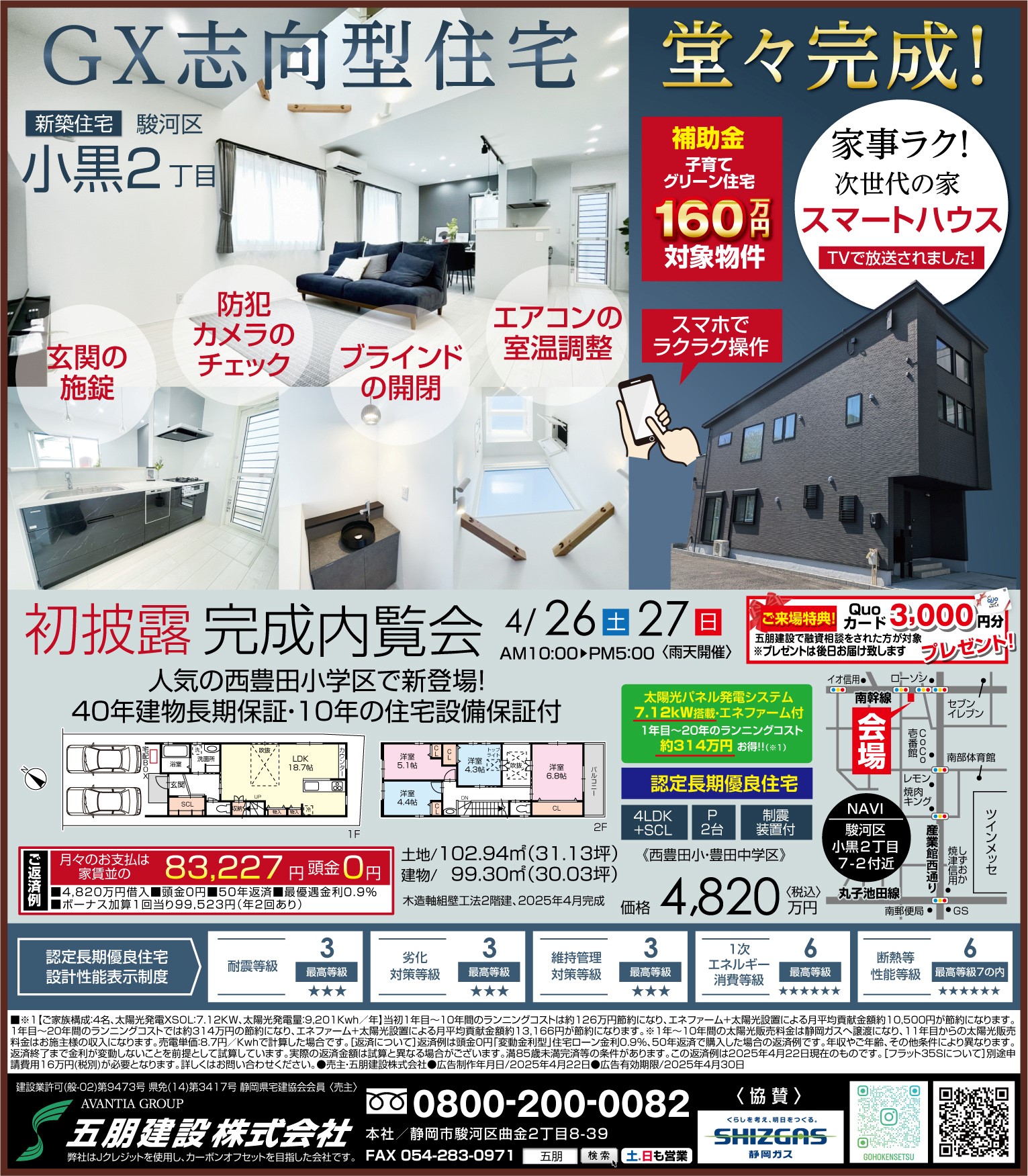 ☆今週末は駿河区小黒完成販売会開催します☆ 2025.04.24未分類 今週末26日27日は駿河区小黒で完成販売会開催します!(^^)! 「五朋建設の家」見てみませんか <駿河区小黒2丁目> 西豊田小・豊田中学区! 場所:静岡市駿河区小黒2丁目7-2 付近 スマートハウスや吹き抜けなど見どころが」沢山ありますよ!(^^)! ご来場お待ちしておりますm(__)m 五朋建設はインスタも随時投稿してます!! こちらもチェックしてみてくださいね(^^) ▶インスタはこちらから☟