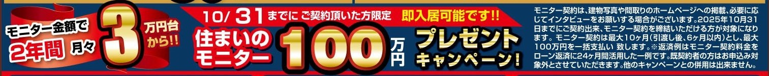 モニター契約を10月31日までに締結していただける方が対象になります。 モニター契約は最大10ヶ月(引渡し後、6ヶ月以内)とし、最大100万円を一括支払い 致します。既契約者の方はお申込み対象外とさせていただきます。