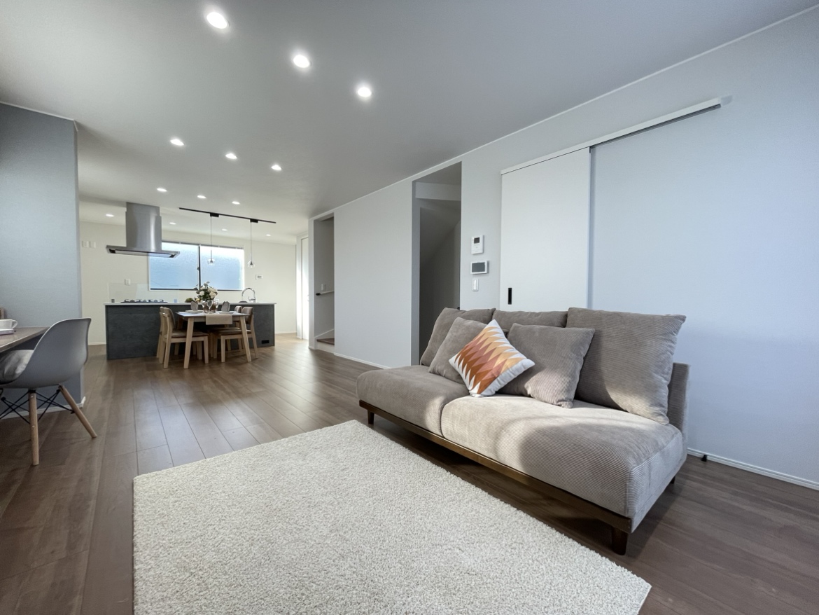 リビングは22帖の大空間!お友達にも自慢できる広さですね!!照明やカーテン、オシャレなペンダントライト、エアコンまでついてます!!