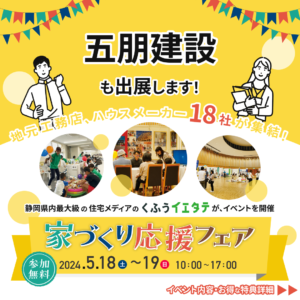 5/18・19はイエタテ家づくり応援フェア! 2024.05.16未分類 おはようございます。 今週末はツインメッセ静岡にて イエタテ主催『家づくり応援フェア』が開催されます! 家づくりに関するお悩みを一度に解決できるチャンスです! 入場無料!事前予約をしてご参加いただくとAmazonギフト券3,000円分をプレゼント! またとないこのチャンス!お見逃しなく!