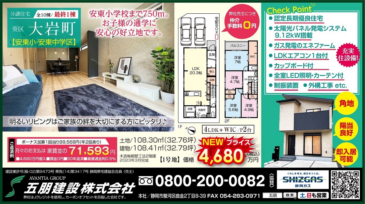 五朋建設の建売住宅は耐震等級3の認定長期優良住宅・太陽光設置・エネファーム付きの建売住宅です。