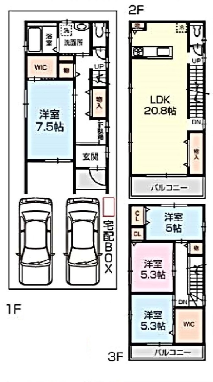 1階に主寝室、WIC、水回り、2階には20帖以上のLDKと3階は3部屋のプラン