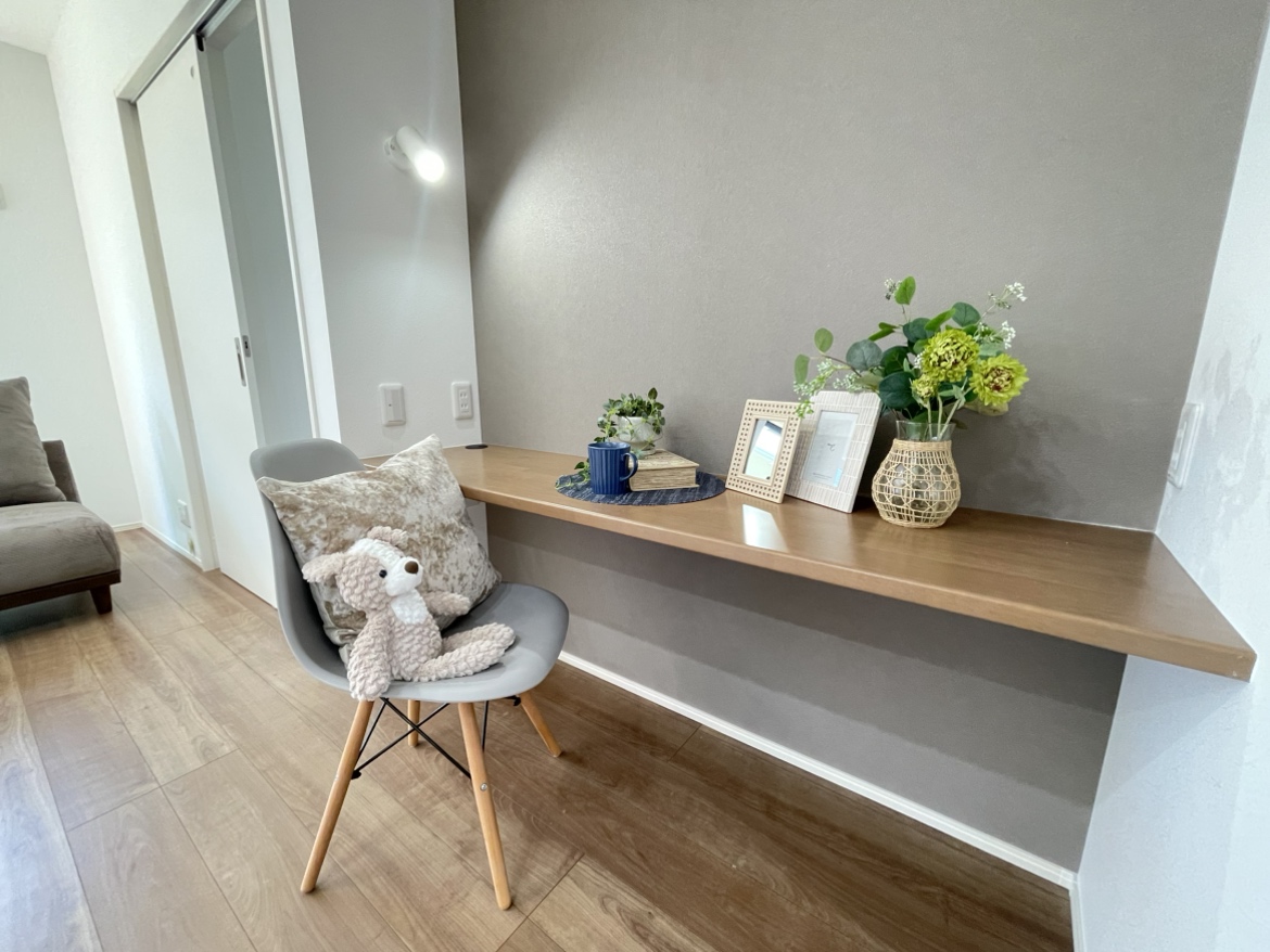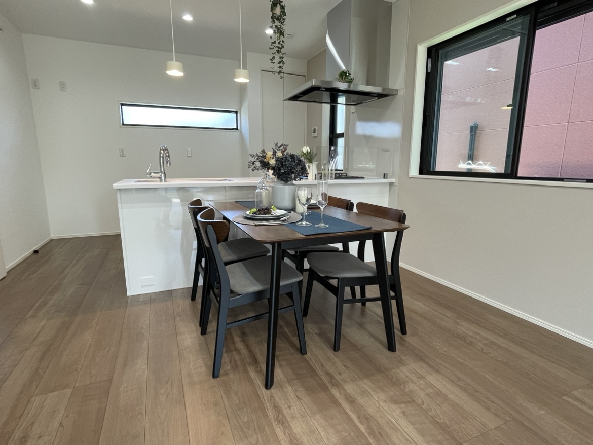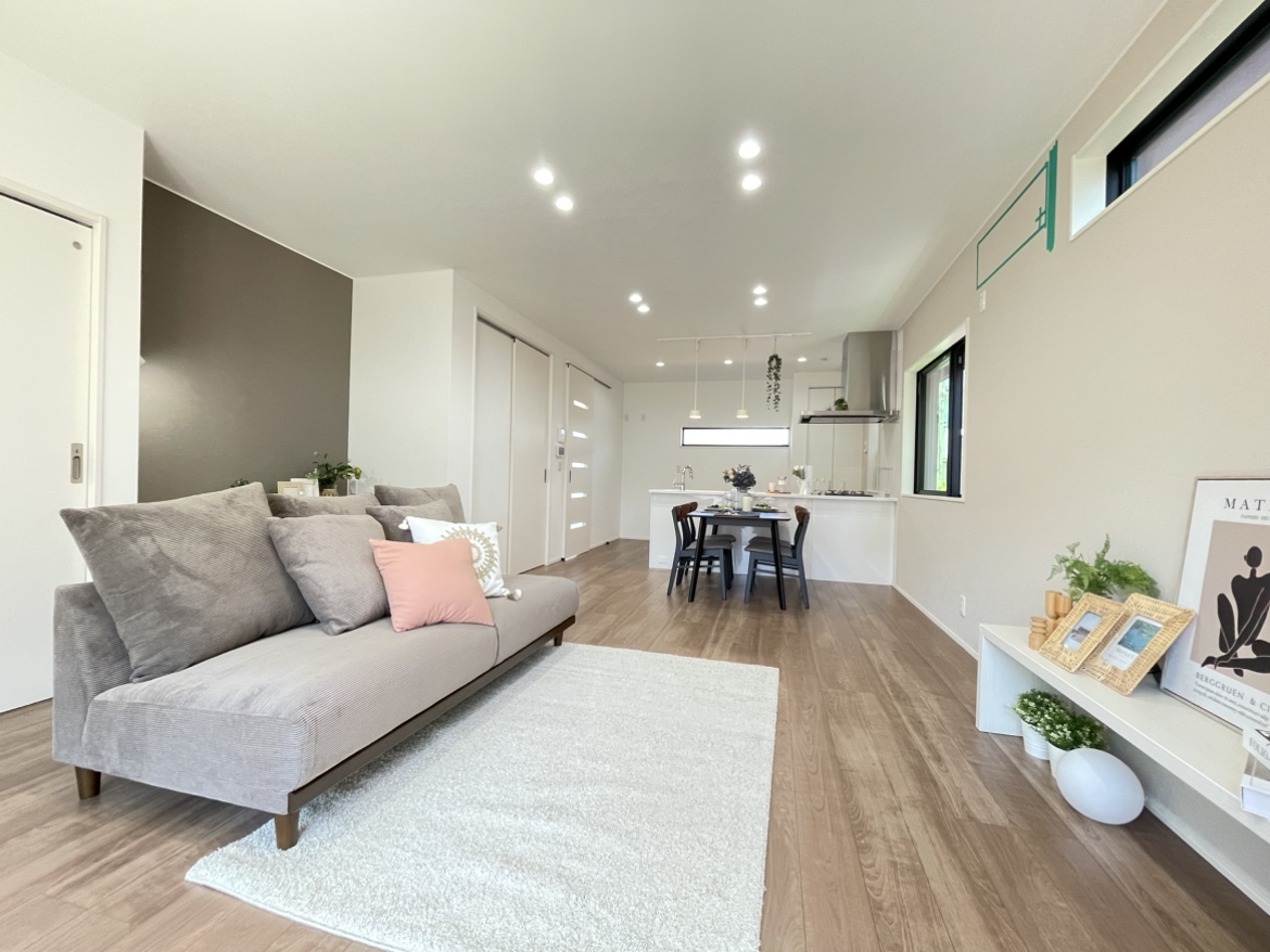 リビングは21帖の大空間!スタイリッシュなアイランドキッチン&ワークスペースとしても活躍するカウンター机も設置!