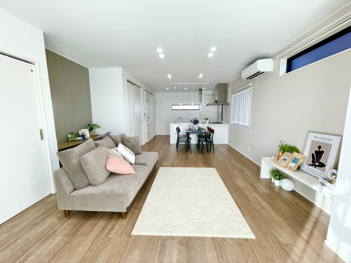 リビングはゆとりの20帖。スタイリッシュな内装で、家族みんながゆったりくつろげる心地よい空間です。