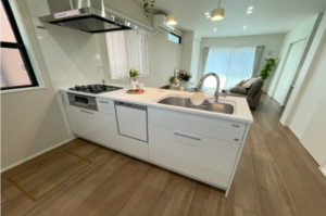 リビングは21帖の大空間!スタイリッシュなキッチン&ワークスペースとしても活躍するカウンター机も設置!ご家族みんなでゆったりとくつろげます。