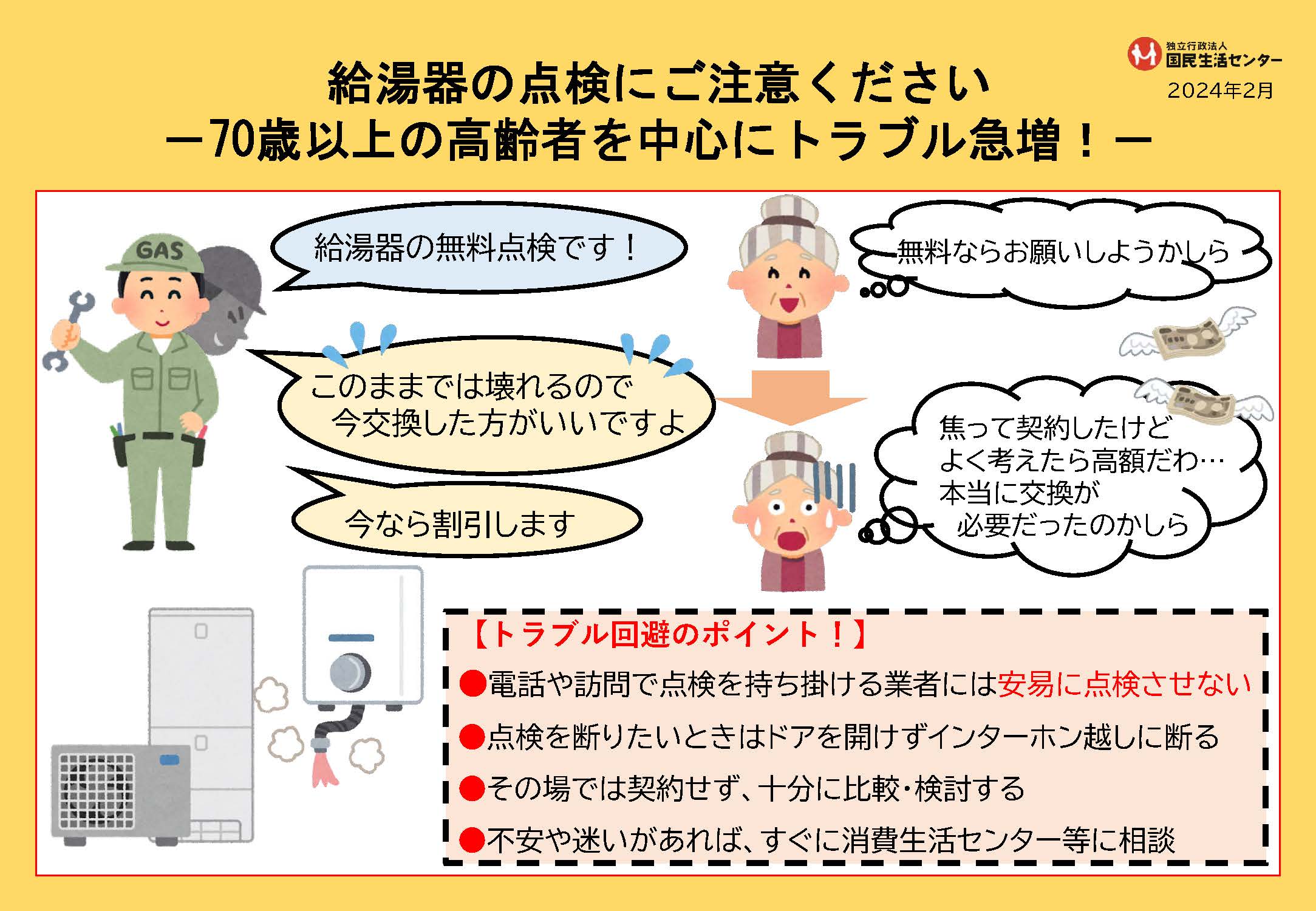 電話や訪問で突然給湯器の点検を持ち掛け、不安をあおって高額な給湯器の交換を迫る手口が多くみられます。中には、電話口で「自治体から委託を受けた」「契約中のガス会社から依頼された」などと身分を偽るケースもみられるようです。