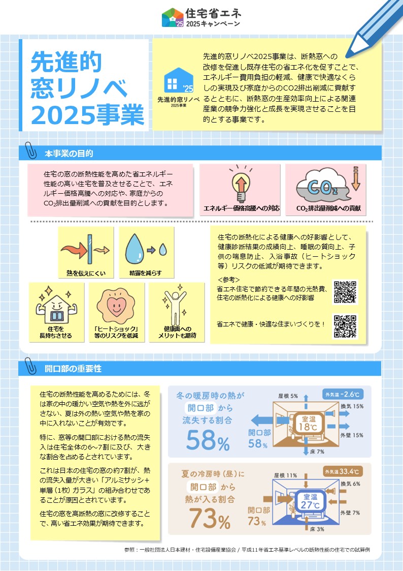 ※先進的窓リノベ2025事業は、既存住宅の早期の省エネ化を図り、エネルギー費用負担の軽減及び住まいの快適性の向上と、2030年度の家庭部門からのCO2排出量66%削減、「ウェルビーイング/高い生活の質」の実現に貢献するとともに、先進的な断熱窓の導入加速により、価格低減を促進することで関連産業の競争力強化・経済成⾧を実現し、くらし関連分野のGXを加速させることを目的とする事業です。