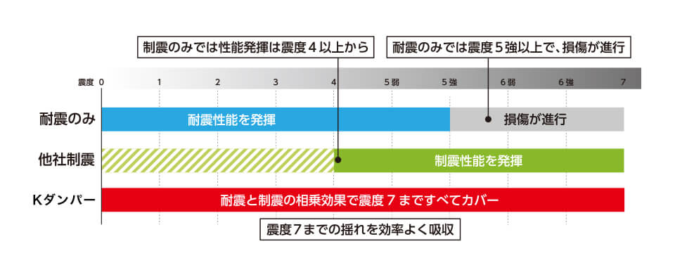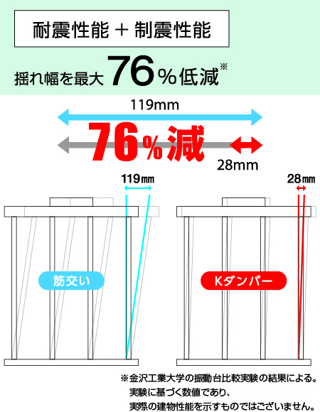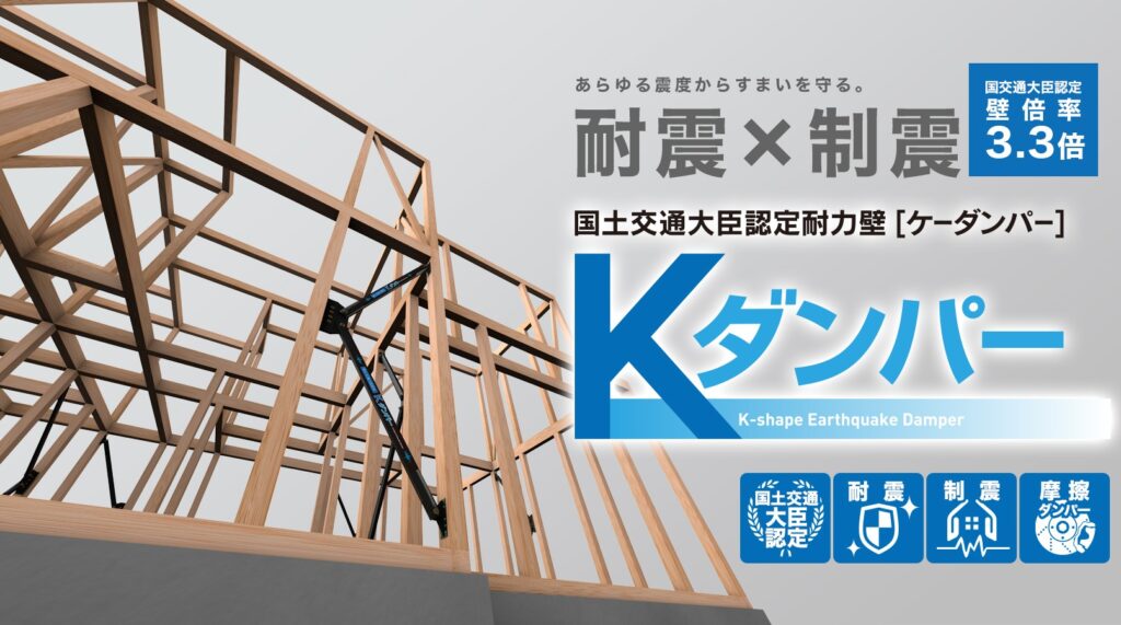 制震ダンパー搭載 2026.01.22未分類 国土交通大臣認定耐力壁 Kダンパー すまいを地震から守る上で重要なのが、地震に構造の強さで抵抗する「耐震」と、地震エネルギーを効率よく打ち消して建物の変形・損傷を抑える「制震」をバランスよく組み合わせることです。 「Kダンパー」は耐震の性能(剛性と耐力で地震の力に抵抗する能力)と制震の性能(耐震エネルギーを吸収する能力)の2つの性能を併せ持つ装置で、効率よく地震の揺れを抑える工夫がされている高性能ダンパーで、耐震と制震の相乗効果で震度7までの幅広い震度をカバーします。