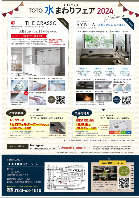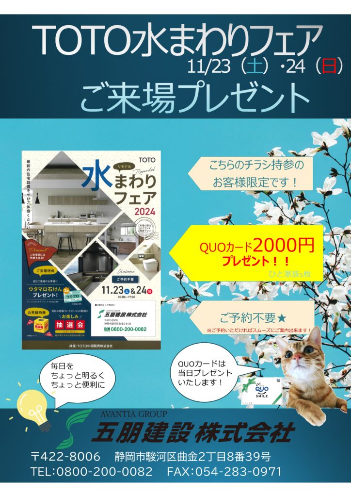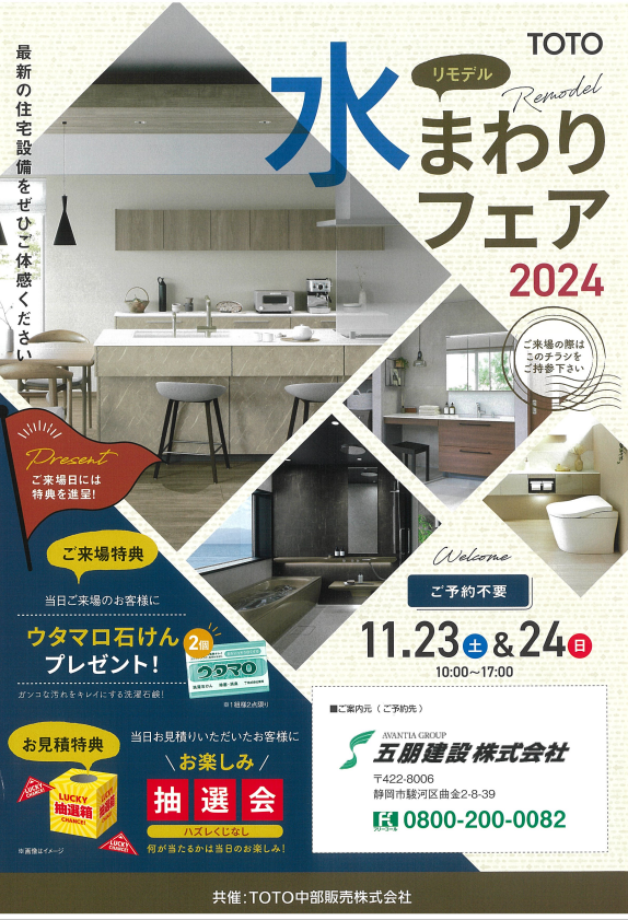 今月のリフォームイベント 2024.11.07未分類 11月23日、24日にTOTO静岡ショールームにてイベントを行います。 ご来場プレゼントもありますので是非参加ください。 よろしくお願いいたします。。