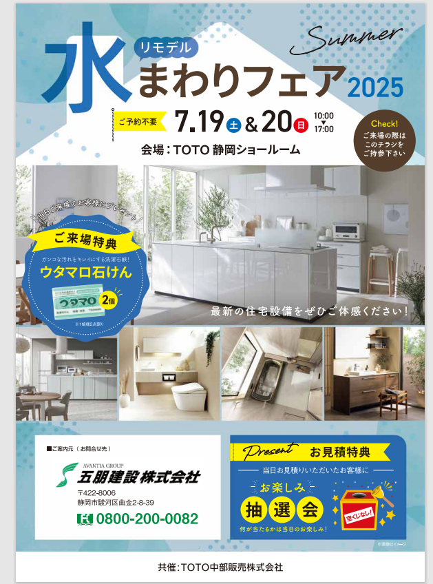 水まわりフエアーのご案内 TOTO 2025.05.22未分類 7月19日(土)~20日(日)TOTO静岡ショールームにて 水まわりフエアーを行います。 是非、最新の設備をご覧ください。 ご来場をお待ちしております。 よろしくお願いいたします。