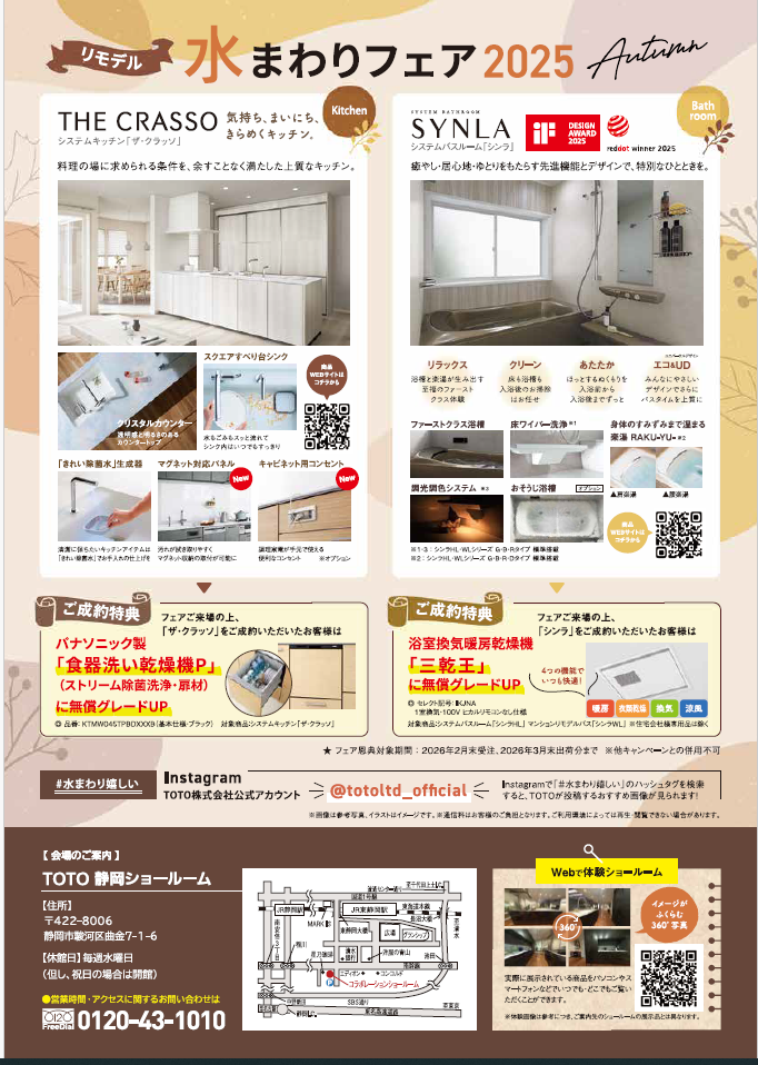 TOTO静岡ショールームイベント 15日&16日 2025.11.10未分類 🌿TOTO静岡ショールーム開催🌿 「水まわりリモデルフェア 」ご案内 いつもお世話になっております。このたびAVANTIA・五朋建設では、TOTO静岡ショールームにて**「水まわりリモデルフェア 2025」**を開催いたします! 🎁ご来場特典 当日ご来場の方に✨ウタマロ石けん2個セットプレゼント!✨ ✨お見積特典 フェア当日にお見積りいただいたお客様にはハズレなしのお楽しみ抽選会にご参加いただけます! 最新の水まわり設備をご確認ください。 ショールームにてお待ちしております。