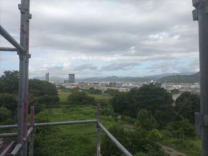 上原2期分譲地の絶景 2023.08.10建設部河野 上原2期分譲地の建設工事が進んでいます。 台風の接近のため、外部足場のメッシュシートをたたみました。 高台にある3階建てということもあり、3階からは市街が一望できる絶景。 絶景は、お金では買えませんよね、、、