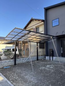 カーポート 2025.01.09建設部河野 建物完成前にご契約いただいたお客様よりカーポートの工事依頼をいただき、本日施工しました。 駐車場の奥行が長かったので、長さ5700間口2700と1台+αを施工しました。 建物側は、玄関の庇・機能門柱(ポスト)に被った位置に施工。 雨の日も、車から傘をささずに玄関に入れます。