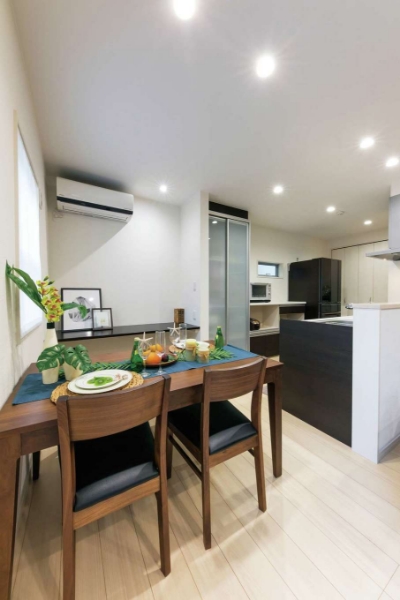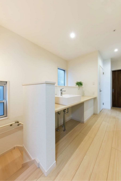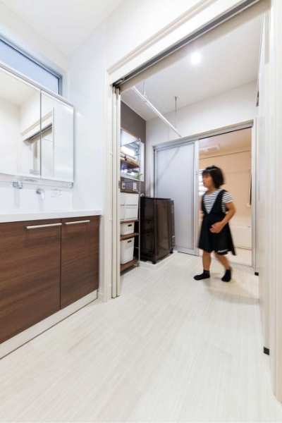 家づくりではデザインと暮らしやすさにこだわり、「設計士さんと話し合いを重ねて、細かい部分まで理想通りにできました」と笑顔で語る奥さま。夫妻のセンスが反映されたシンプルモダンなLDKは、窓を開けるとデッキと一体化し、まるでリゾートホテルのような開放感。お子さまは学校から帰ると家族用玄関で靴を脱ぎ、廊下の収納扉に学用品をしまって、洗面で手洗い・うがいをしLDKへ。動線がスムーズなので朝の仕度も便利で、物も散らからず、いつもキレイをキープできる。特に、洗面室には出入口を2か所設けてあるので「行き来しやすくて便利!」と子どもたちにも好評だ。さらに、省エネ等級4の住宅性能により、「以前のマンションよりも面積は格段と広いのに、光熱費が安くなったのには驚きました」と奥さま。「家を建てている最中はとても楽しくて、建てた後はとても幸せ。それも『五朋建設』さんのおかげです」と嬉しそうに語った。