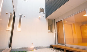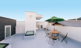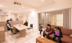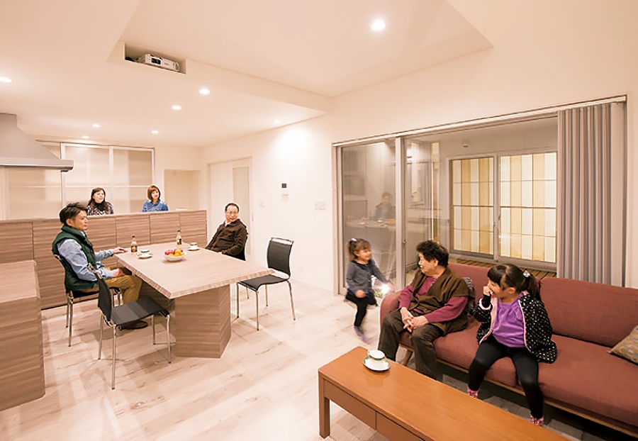 四世代、8人家族が暮らすM邸。『五朋建設』のモデルハウスを見に行ったお母さまは、「この家を売ってください!」とお願いしたほど、ライトコートのある家に魅力を感じたそう。完成した新居は、三方を住宅で囲まれているため、モデルハウスと同じようにライトコート(中庭)を家の中心に配置し、各部屋に採光と通風を確保。リビングはもちろん、北側にある祖母の和室まで明るく開放感に満ちている。2階に上がると、ファミリースペースと子ども部屋、寝室、書斎があり、どの部屋にも十分な収納スペースを設け た。天窓からの光を浴びながら、さらに階段を上がると、そこはスカイバルコニー。隣家の目線を気にすることなく、バーベキューや花火などを思う存分楽しめる。デザインだけでなく、耐震・耐久・断熱性能も『五朋建設』なら安心だ。ひとつ屋根の下で三世帯が 仲良く暮らしながら、それぞれの居場所もあるM邸は、孫たちの代になっても快適に住み継いでいける。