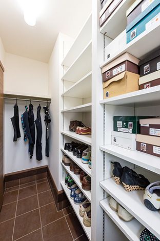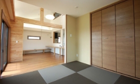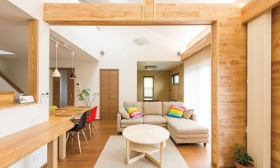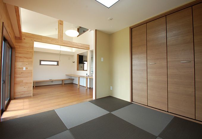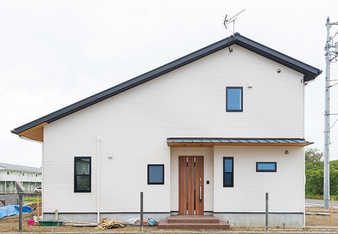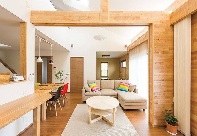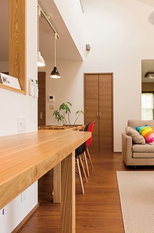 大きな屋根が南に向かって延びるU邸。広い敷地を利用した大胆なフォルムは、木の軒も設けられ、どことなく和の風情も漂わせる。さらにリビングダイニングの大空間の吹抜けは、圧倒的な存在感を放つ。梁と南側の壁には、サクラの無垢材が張られ、ナチュラルな木目と色合いが目を楽しませてくれる。「モダンな家づくりが得意な『五朋建設』さんですが、いろいろとわがままを聞いてもらって、自分が好きなナチュラルなインテリアに仕上げてもらいました」とUさん。和室と寝室の塗り壁は、ご主人自ら塗り上げたもの。「造作カウンターのオイル塗装も、僕がやりました」とDIYの得意なご主人ならではの仕事が家中のさまざまな場所で生かされている。家は一生をかけて作り上げていくもの、そんな言葉を体現するUさん夫妻の笑顔が家の中を明るく照らし出していた。