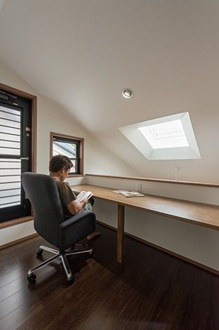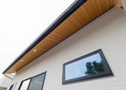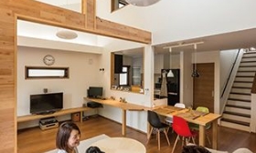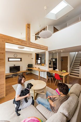 - 最大の見せ場は、勾配屋根による大胆な外観フォルムと、1階LDKの圧倒的大空間の吹抜けです。天窓と南側の大窓から光が美しく差し込みます。造作カウンターや、表わしの梁、壁パネルには木をたっぷりと使用し、ナチュラルなイメージに仕上げさせていただきました。