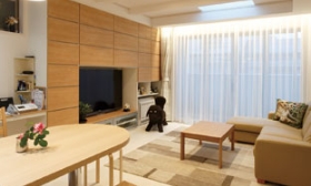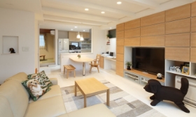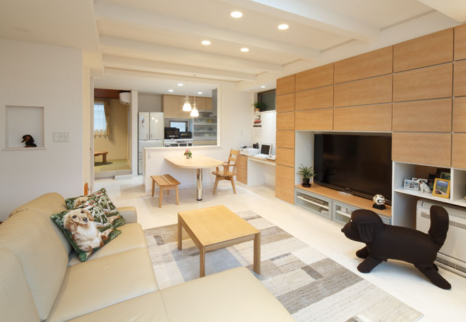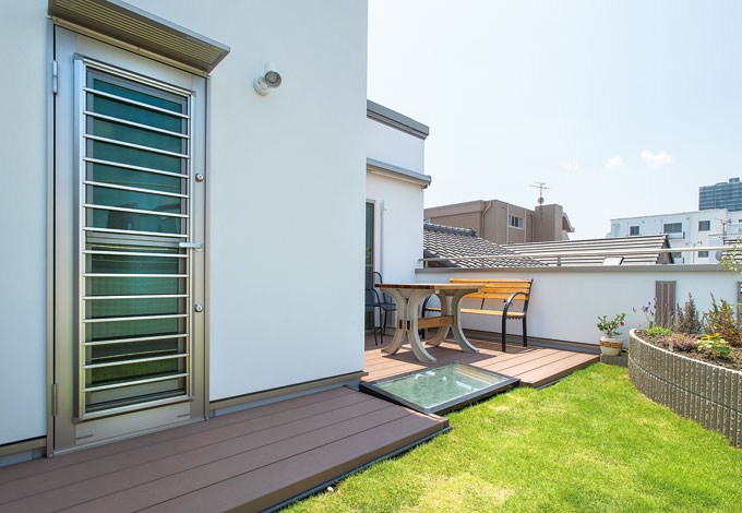 「担当の大木さんと河野さんが居たからこそ出来た家ですね。無理難題も多くて現場設計サイドの方も大変だったと思います」と話す奥さま。数々のモデルハウスをめぐり、大量の住宅関連誌を購入して自分達の住みたい家を思い描いていたという。10歳になる愛犬アルちゃんとの生活を中心に、シンプルかつ機能的で快適な暮らしができる家。何度も色調整をした外壁の色や、アルちゃんと遊べるプライベートも確保した屋上庭園、西日の暑さから解放される北向きの明るいリビング。マンションで暮らしていた時は南西向きで西日が強く、洗濯物の日焼けや夏の暑さが辛かったそう。現在3階建2階部分にある北向きのリビングには、ベランダに続く大きな開口とやわらかに採光する天窓、LED 間接照明が効果的に使われ明るさも十分。「今年の夏が楽しみ」と微笑む奥さまが印象的だ。限りある敷地に十分な広さを設けた理想的な3階建て住宅に喜びの声が響く。